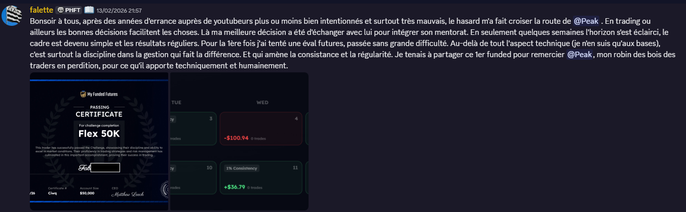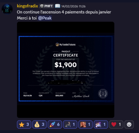- Accès permanent aux groupes privés Discord et à la communauté PHF Trading.